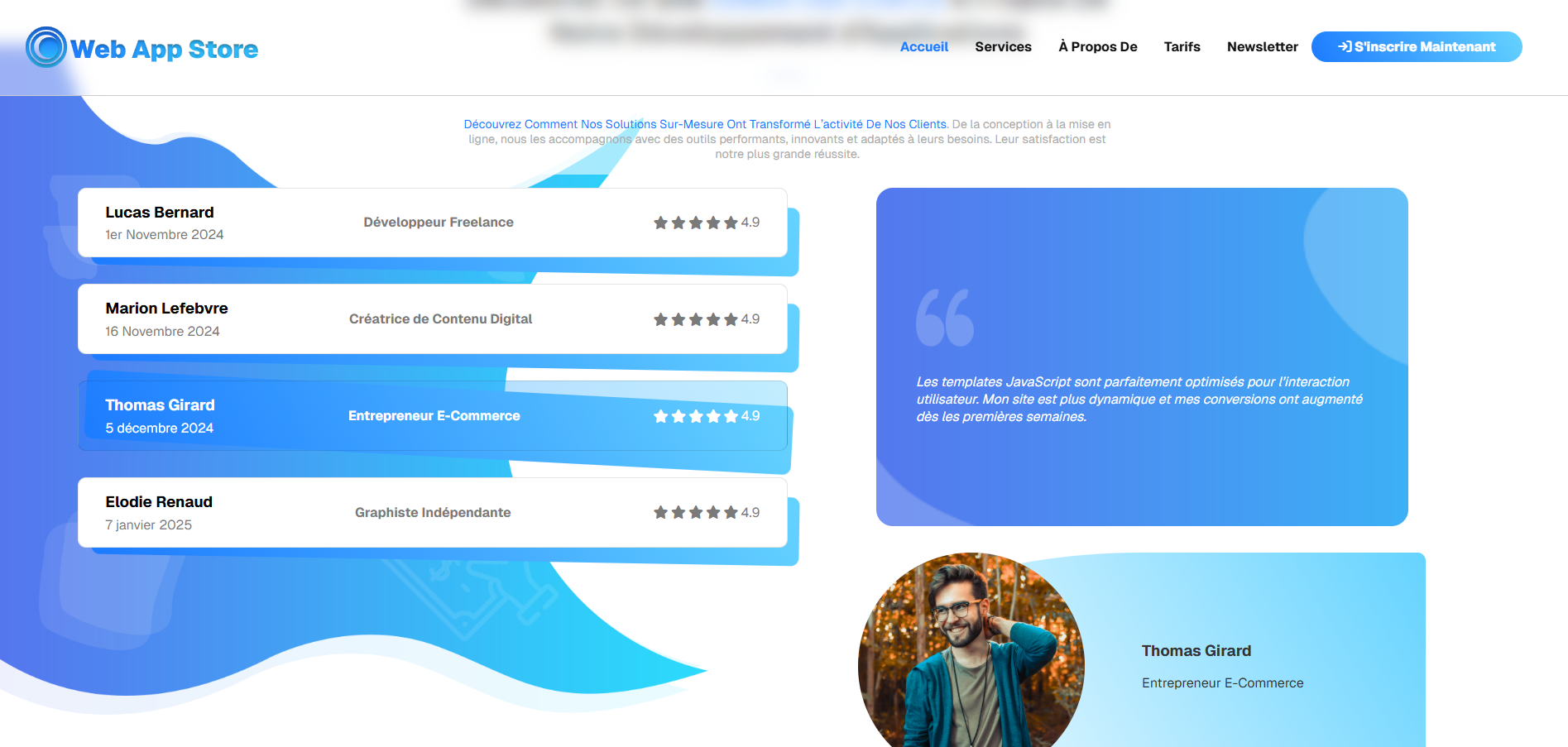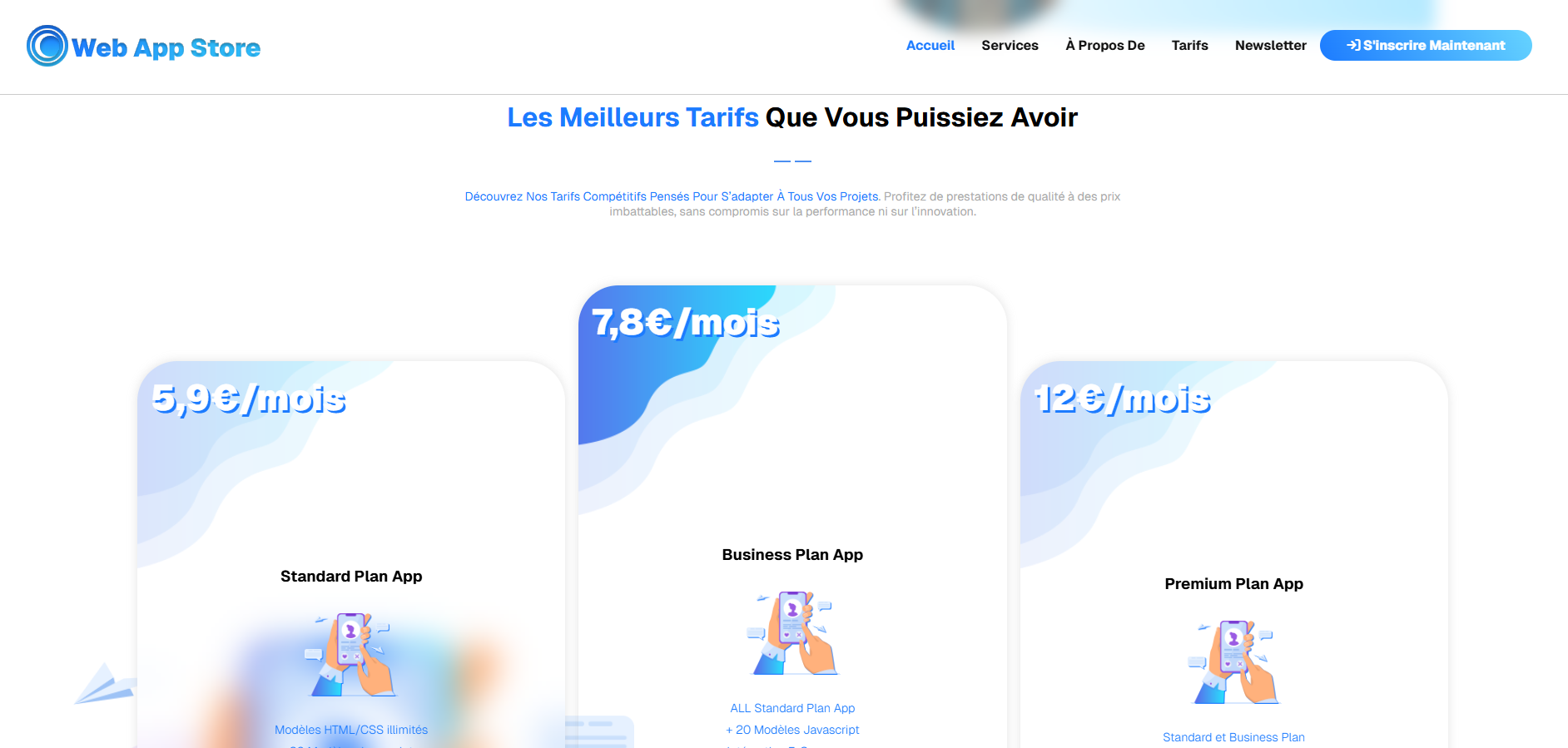 Web App Store est une application web responsive qui propose une collection de templates et modèles pour le développement web. La plateforme offre des solutions clés en main pour différents types de projets, du simple site vitrine aux applications e-commerce complexes.